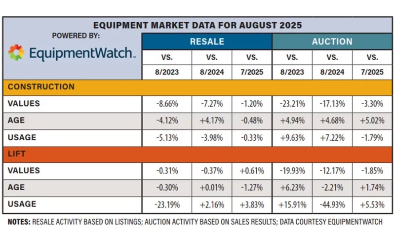 Prices for used equipment continued to slip in August, down 7.27% year-over-year in resale and 17.13% at auction. Prices also slipped for equipment in the lift category, reflecting a slow slide that has continued for most categories of used machines EquipmentWatch has tracked throughout this year. “These values all make sense to me. There’s nothing crazy going on [in the used equipment market] right now,” Gallagher says. “As the age of equipment comes up we expect prices to go down, and the tariff talk has mostly died down for now—it didn’t have a big impact this year.”