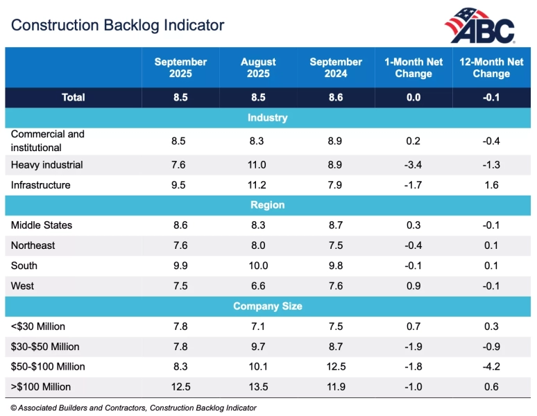 The Construction Backlog Indicator reached 8.5 months in September, according to a survey by the Associated Builders and Contractors. The figure shows no change from the previous month. Since September 2024, backlog has fallen 0.1 months.