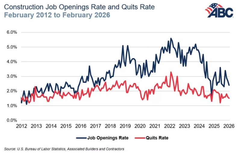 “The combination of historically slow hiring and exceedingly few separations made February 2026 the month with the least construction labor force churn since the [Bureau of Labor Statistics] began this survey in December 2000,” said Basu.