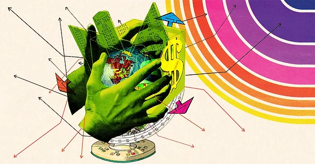 Collage illustration by Scott Hilling/ENR, original hands holding geometric shapes, corner circular rainbow, globe held in hands, dollar sign, geometric lines and arcs on a globe, flight plan chart, video game controller and globe all by Getty Images/CSA-Printstock, thin arrows in red and black original artwork by Getty Images/Deagreez