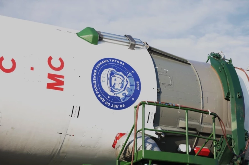 На головной обтекатель ракеты-носителя нанесена эмблема, посвященная 90-летию со дня рождения Германа Степановича Титова. Второй космонавт планеты и первый человек, который провел сутки вне Земли родился 11 сентября 1935 года.