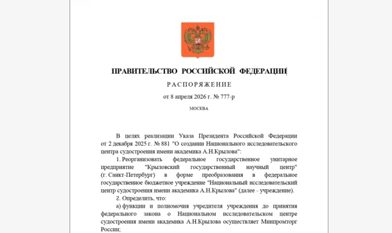 Как следует из текста документа, Крыловский государственный научный центр преобразуют в федеральное государственное бюджетное учреждение «Национальный исследовательский центр судостроения имени академика А.Н. Крылова».
