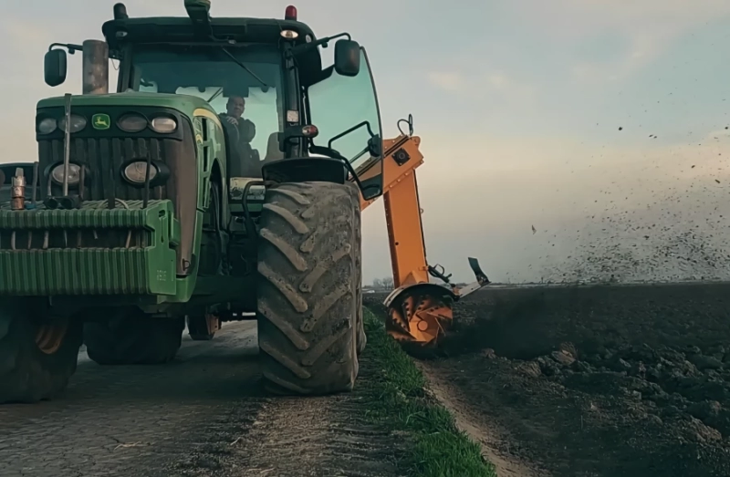Новый копатель отбрасывает почву до 19 м влево, достигает 1,5-4,7 м от центра трактора и до 2,74 м глубины. Круглое копающее колесо бережёт стенки канавы и сохраняет дерн.