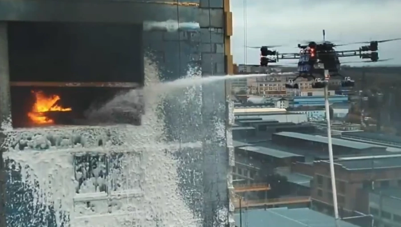 Испытание БПЛА по тушению пожара на высоте 50 м. Скриншот видео: «Лаборатория будущего».