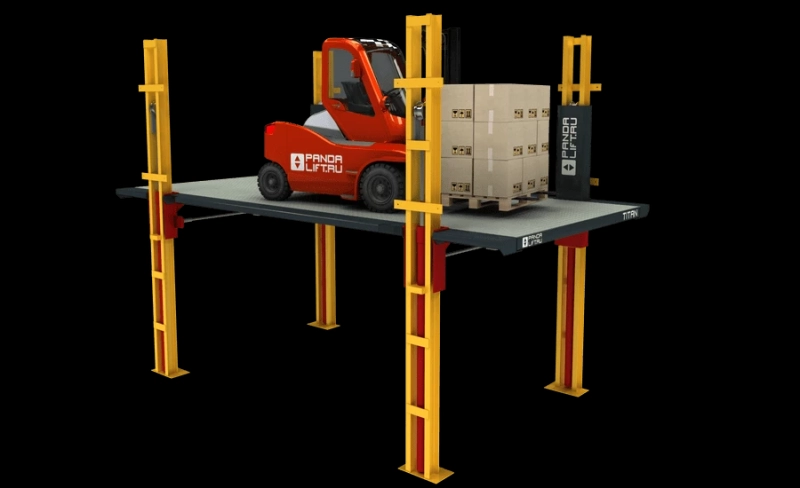 Четырехколонный гидравлический подъемник TITAN – самый мощный подъемник в линейка подъемников PANDA LIFT. Он подходит для перемещения грузов массой до 25 тонн на высоту до 44 метров. Иллюстративное изображение: PANDA.
